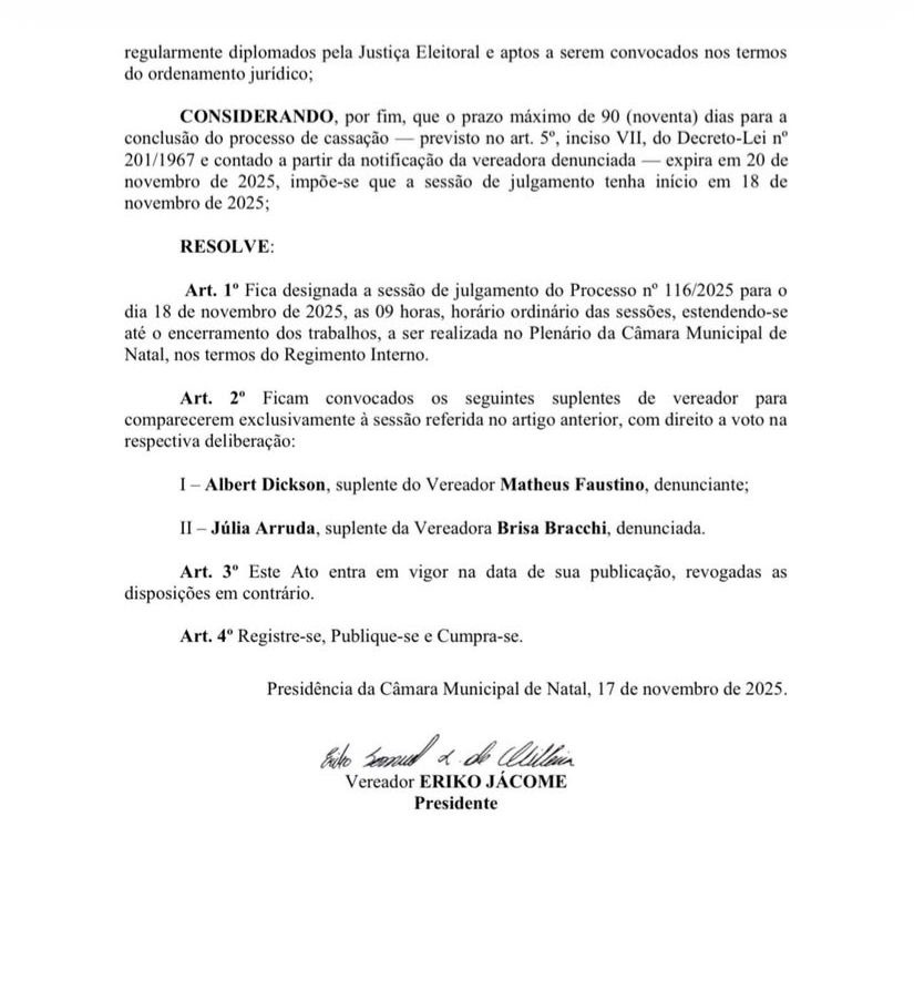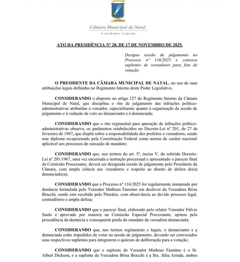 A Câmara Municipal de Natal marcou para esta terça-feira (18), às 9h, a sessão de julgamento que vai definir se a vereadora Brisa Bracchi (PT) perderá ou não seu mandato. A decisão consta no Ato da Presidência nº 28/2025, publicado nesta segunda-feira (17), e assinado pelo presidente da Casa, vereador Eriko Jácome.