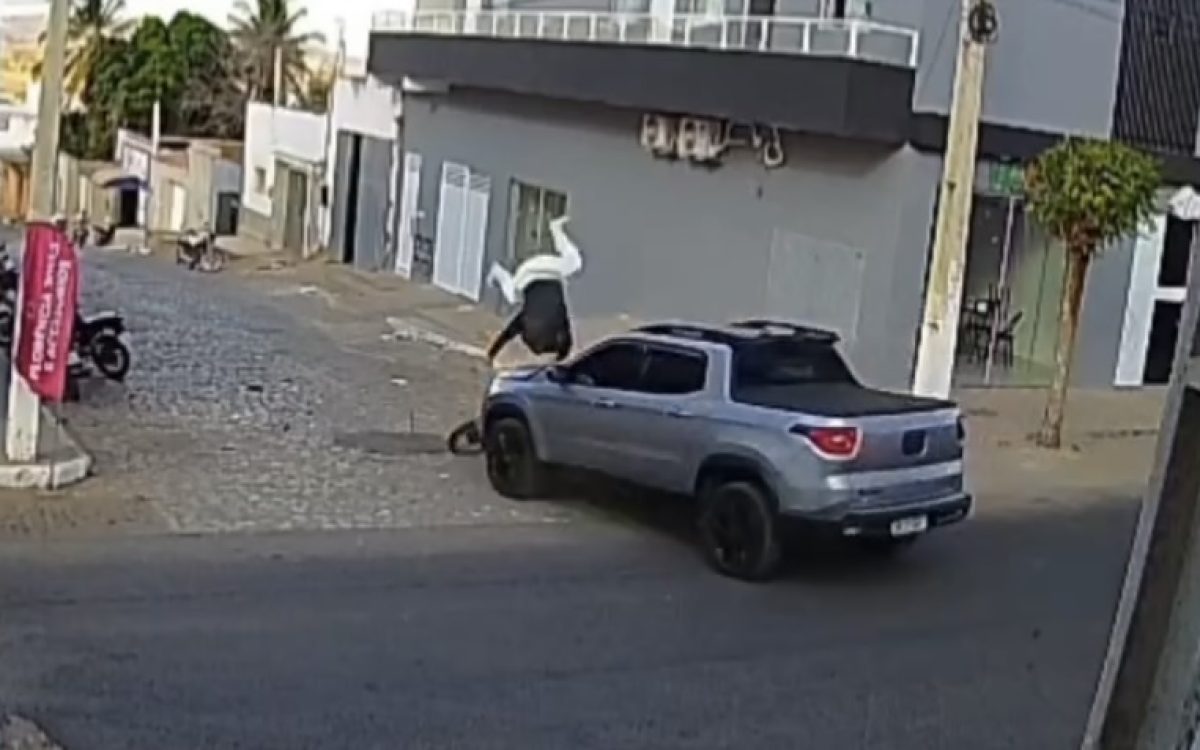 ACIDENTE: Uma câmera de monitoramento flagrou, na tarde desta quarta-feira (10 de dezembro), um grave acidente de trânsito em um cruzamento na zona urbana de São Miguel. A colisão envolveu uma picape de cor prata e uma motocicleta. As imagens, registradas às 15h59, mostram o momento em que o motorista da picape (modelo Fiat Toro) avança o cruzamento para realizar uma conversão à esquerda. Nesse instante, uma motociclista que trafegava pela via preferencial colide violentamente contra a lateral dianteira do carro. Com a força do impacto, a mulher que conduzia a moto foi arremessada por cima do capô do veículo, caindo bruscamente sobre o calçamento. O vídeo mostra que o motorista da picape parou imediatamente e desceu do veículo, demonstrando desespero com a situação. Populares que estavam em estabelecimentos comerciais próximos e transeuntes correram rapidamente para o local para prestar os primeiros auxílios à vítima e sinalizar a via. A motocicleta envolvida no acidente, identificada pela placa MYD-3302,