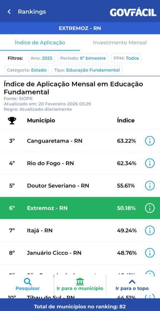 Os números constam nos rankings divulgados pelo GovFácil, com base em dados do SIOPS (Sistema de Informações sobre Orçamentos Públicos em Saúde) e do SIOPE (Sistema de Informações sobre Orçamentos Públicos em Educação). No levantamento mais recente, Extremoz aparece entre os primeiros colocados entre dezenas de municípios potiguares avaliados.