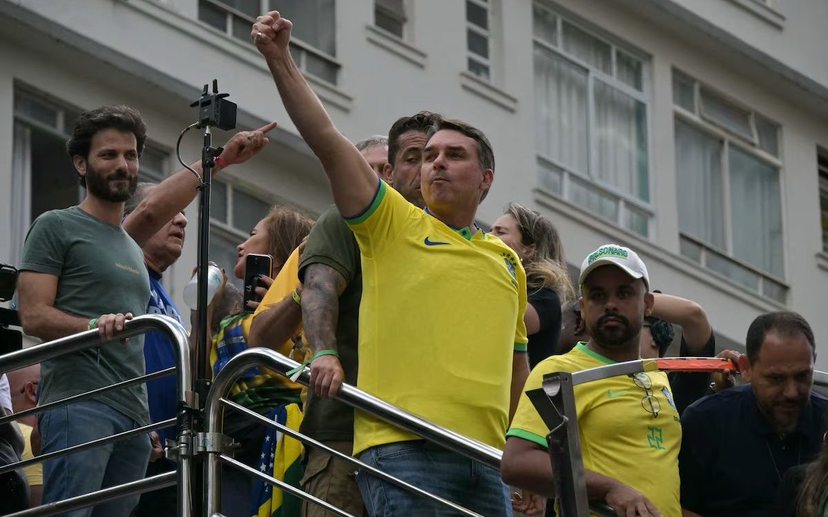 Flávio chegou à manifestação, parou numa das vias às margens da avenida e foi a pé com aliados – entre eles o deputado federal Nikolas Ferreira (PL-MG) e o governador de Minas Gerais, Romeu Zema (Novo) – até o trio elétrico principal, que estava localizado na altura do Masp.