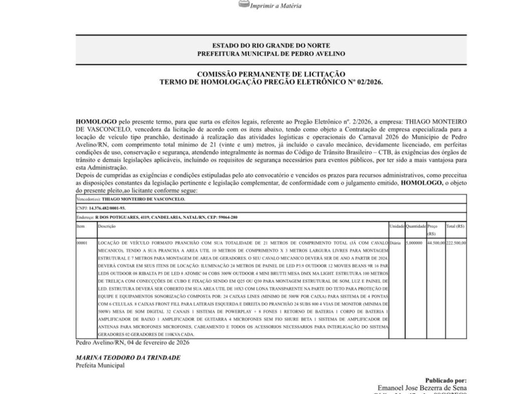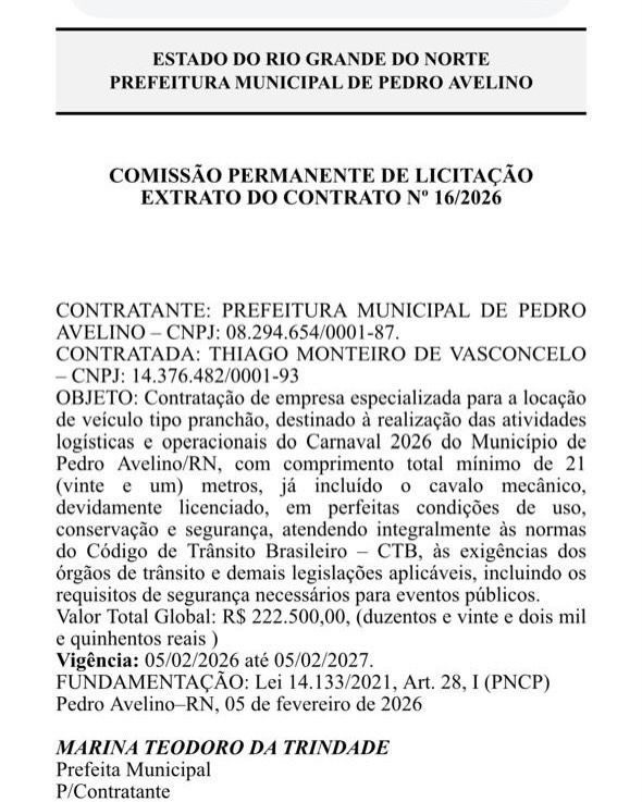 A Prefeitura de Pedro Avelino autorizou um processo licitatório no valor de R$ 222.500,00 para a locação de um trio elétrico tipo pranchão, contratado junto à empresa Thiago Monteiro de Vasconcelos, CNPJ 14.376.482/0001-93. O gasto, por si só elevado, se torna ainda mais revoltante diante da realidade enfrentada pela população.