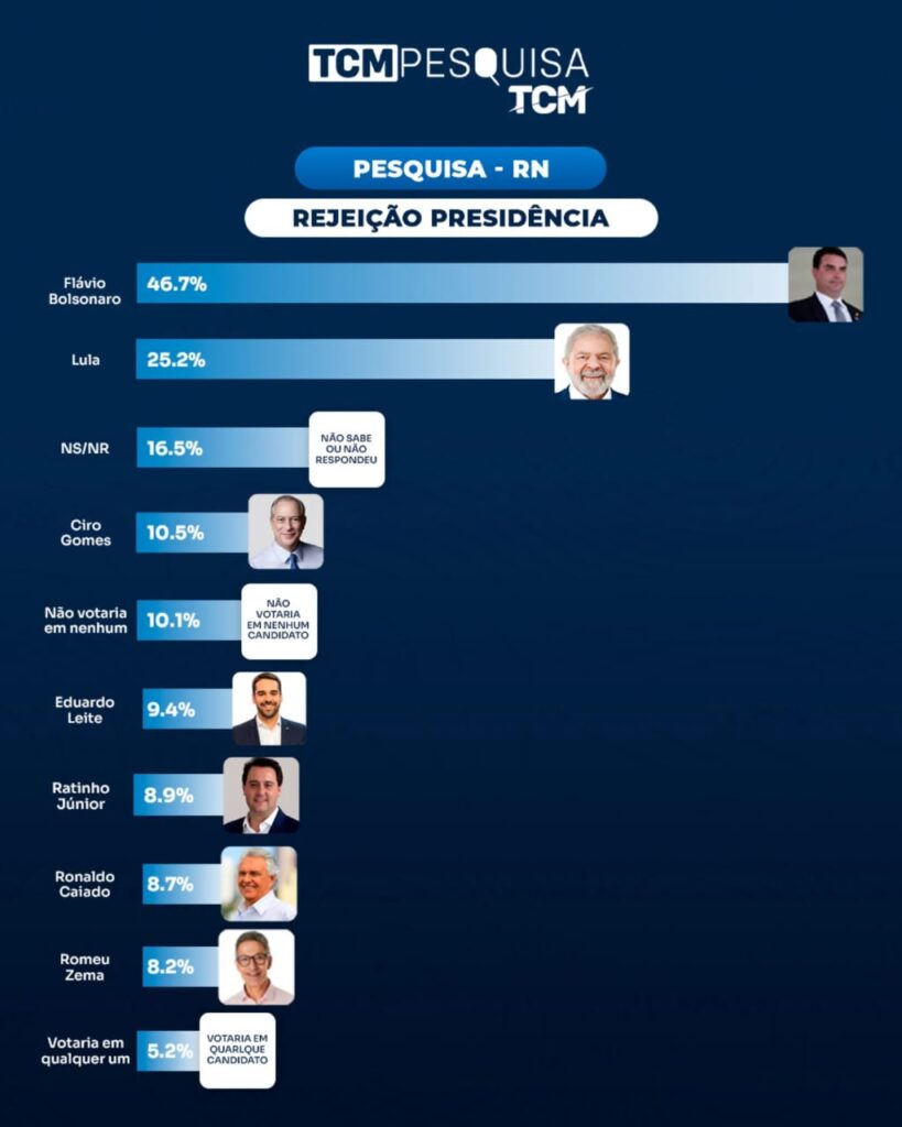 Levantamento realizado com 1.870 eleitores do Rio Grande do Norte indica que 46,7% dos entrevistados afirmaram que não votariam em Flávio Bolsonaro. Em seguida aparece o presidente Lula, com 25,2% de rejeição.