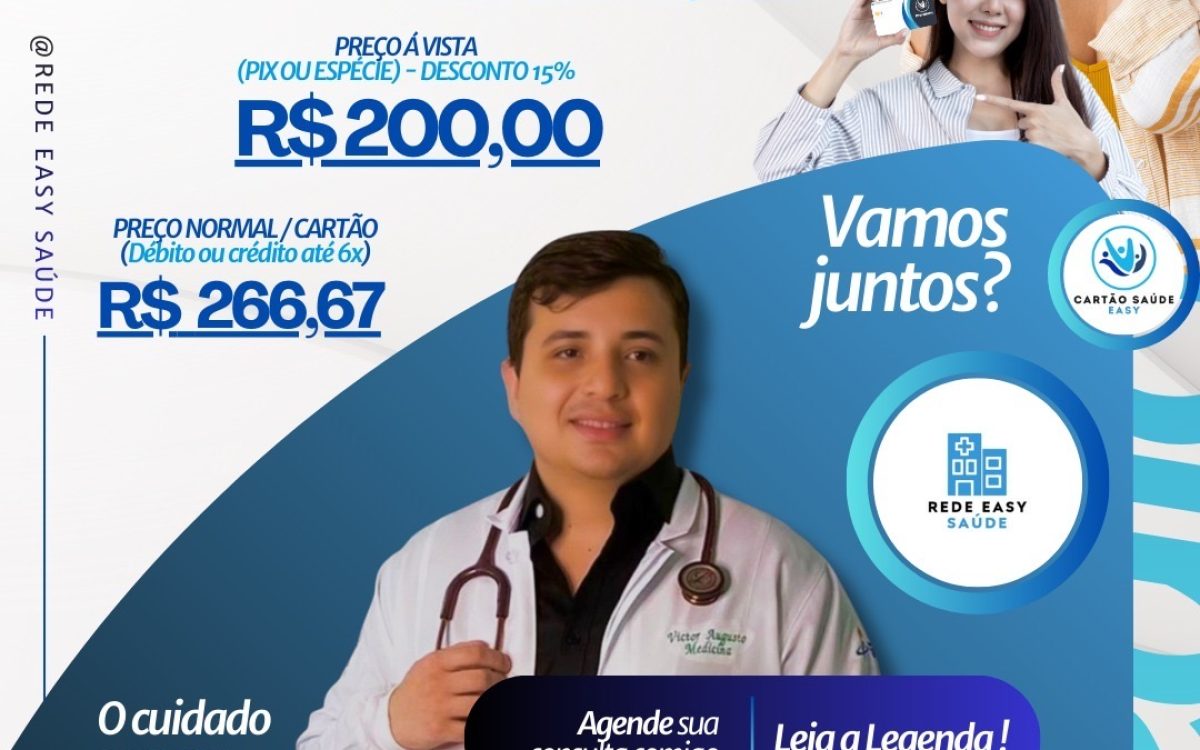 O atendimento é realizado pelo neurologista Dr. Victor Augusto, e os preços variam de acordo com a forma de pagamento. Para usuários do Cartão Saúde Easy ou Saúde Easy Premium, o valor da consulta é de R$ 160, com desconto de 40% para pagamentos via PIX ou em espécie. Já o pagamento à vista, também por PIX ou dinheiro, garante desconto de 15%, com valor final de R$ 200. No cartão de crédito ou débito, o preço normal é de R$ 266,67, com possibilidade de parcelamento em até seis vezes.