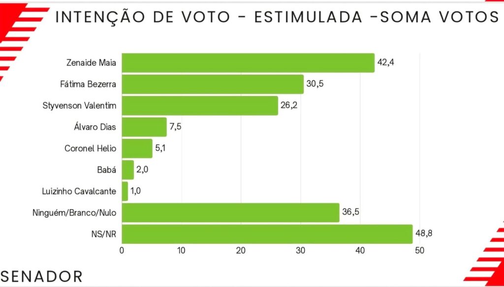 Na soma de votos, Zenaide aparece com 42,4% das intenções de voto. A governadora Fátima Bezerra ocupa a segunda colocação, com 30,5%, seguida pelo senador Styvenson Valentim, que registra 26,2%.