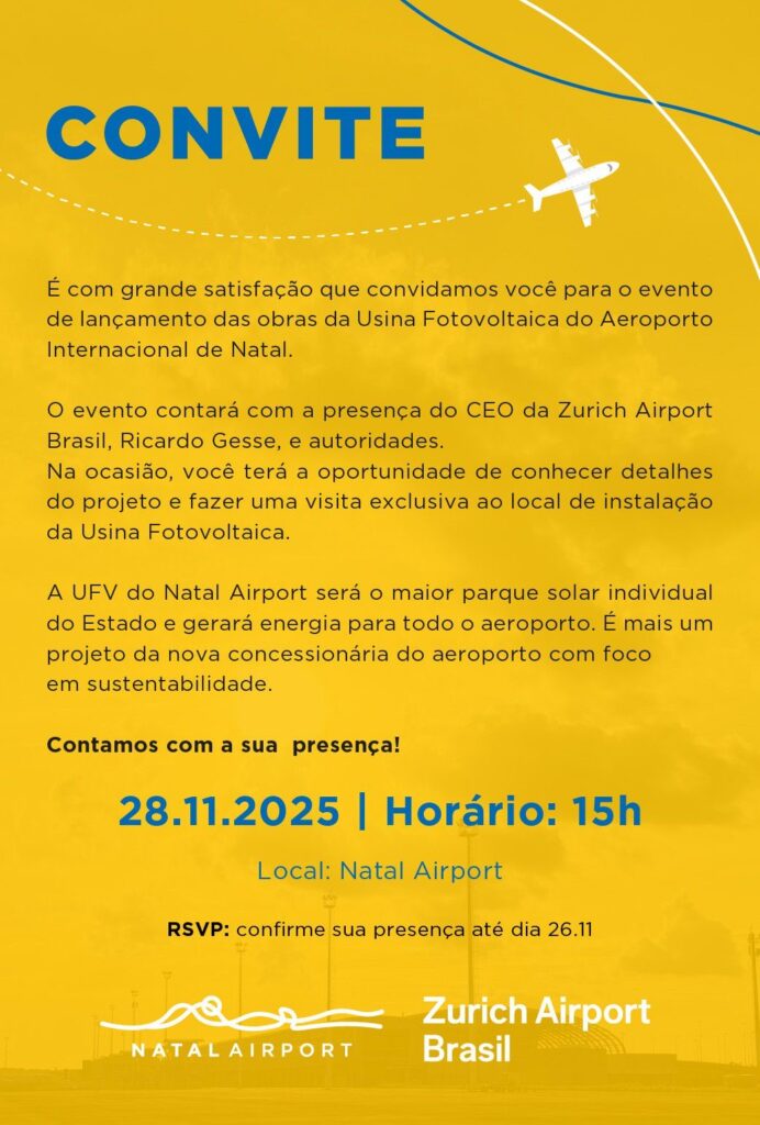 O Aeroporto Internacional de Natal, em São Gonçalo do Amarante, dará início na próxima sexta-feira (28) à construção de sua Usina Solar Fotovoltaica, projeto que reforça o compromisso do terminal com a sustentabilidade e a inovação.