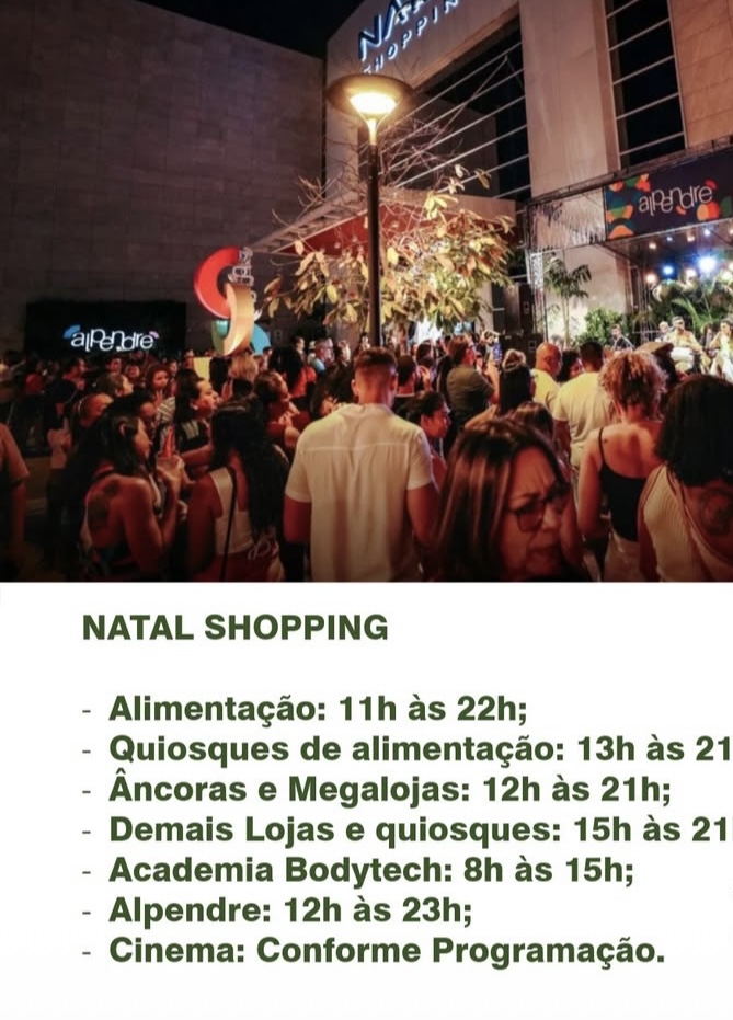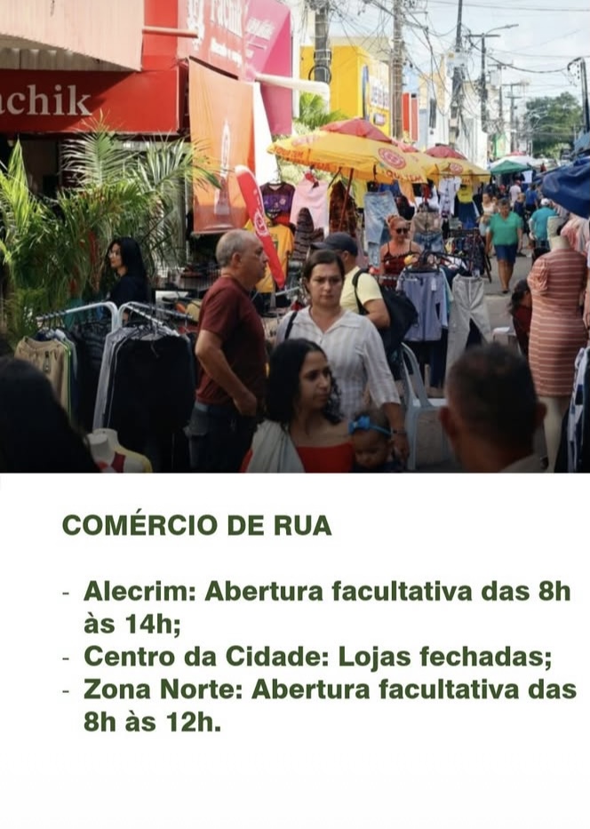 No Alecrim, as lojas poderão abrir das 8h às 14h. Na Zona Norte, o comércio terá funcionamento facultativo entre 8h e 12h. No Centro, as lojas permanecerão fechadas.
