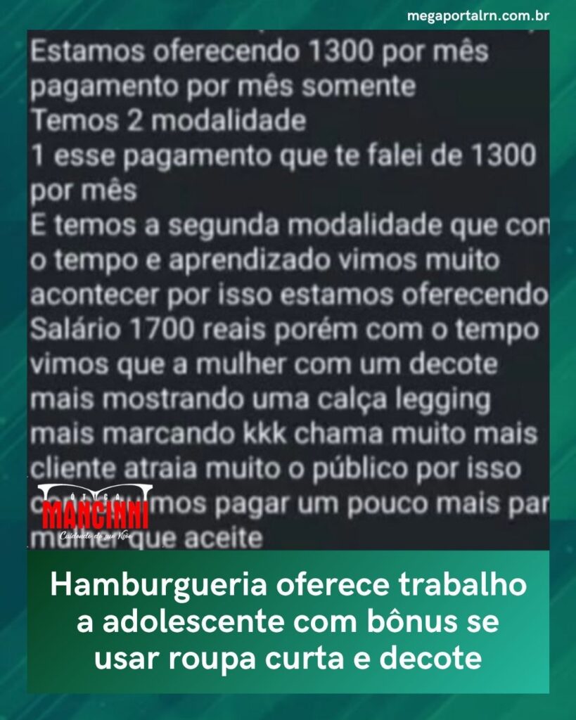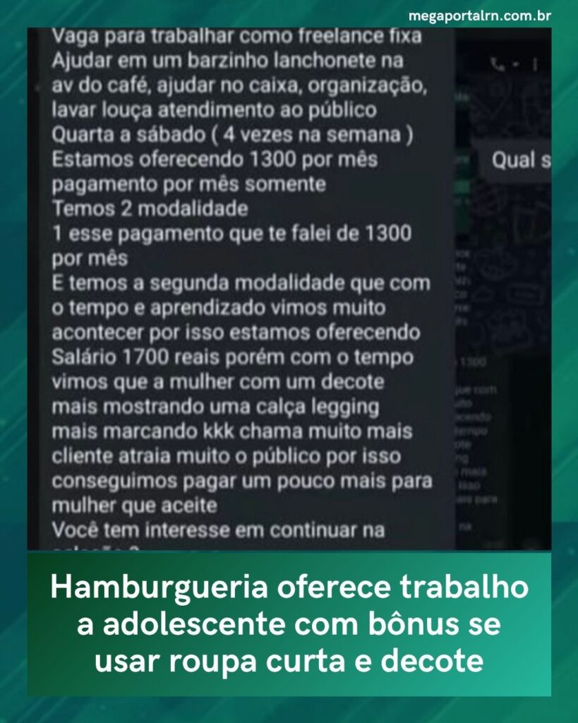 Uma hamburgueria tornou-se alvo de investigação após oferecer emprego a uma adolescente com promessa de bônus financeiro caso utilizasse roupas curtas.A jovem, de 17 anos, relatou à EPTV que ficou em choque e abalada com a situação. O dono da hamburgueria reconheceu, ao UOL, que “errou” ao adotar a abordagem. Ele também diz que vem recebendo ameaças.A família da jovem procurou a polícia e registrou boletim de ocorrência por importunação sexualAdolescente relatou à EPTV choque e disse que ficou abalada com a situaçãoFonte: UOL