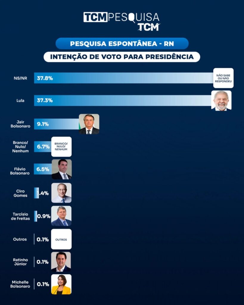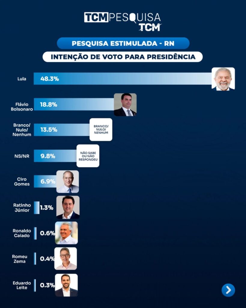 No cenário estimulado, quando os nomes dos candidatos são apresentados aos eleitores, Lula amplia a vantagem, alcançando 48,3% das intenções de voto no Rio Grande do Norte.