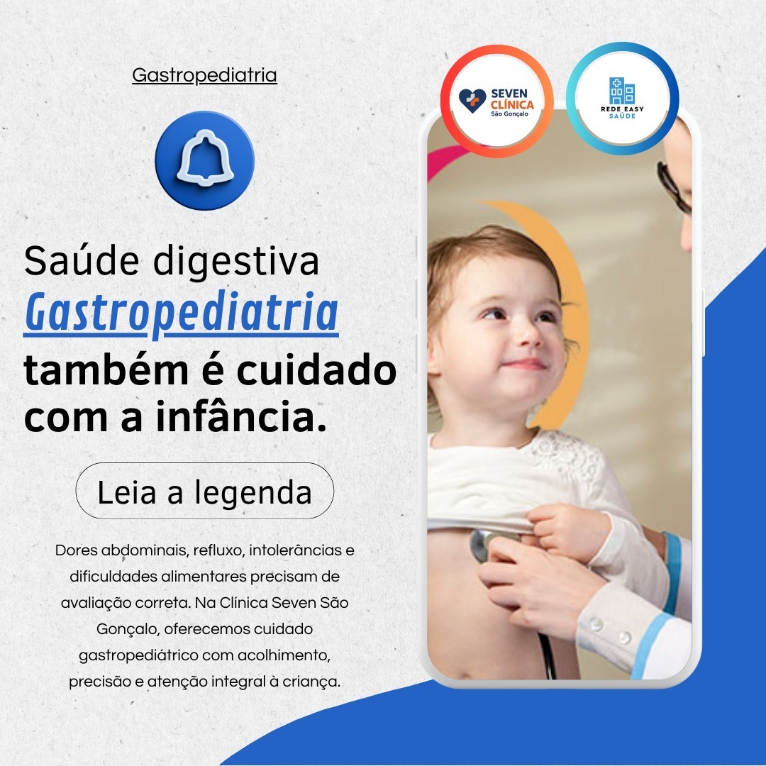 A Clínica Seven São Gonçalo, oferece atendimento especializado em gastropediatria, com foco na saúde digestiva infantil. O serviço é voltado para o diagnóstico e acompanhamento de dores abdominais, refluxo, intolerâncias alimentares e outras alterações gastrointestinais na infância.