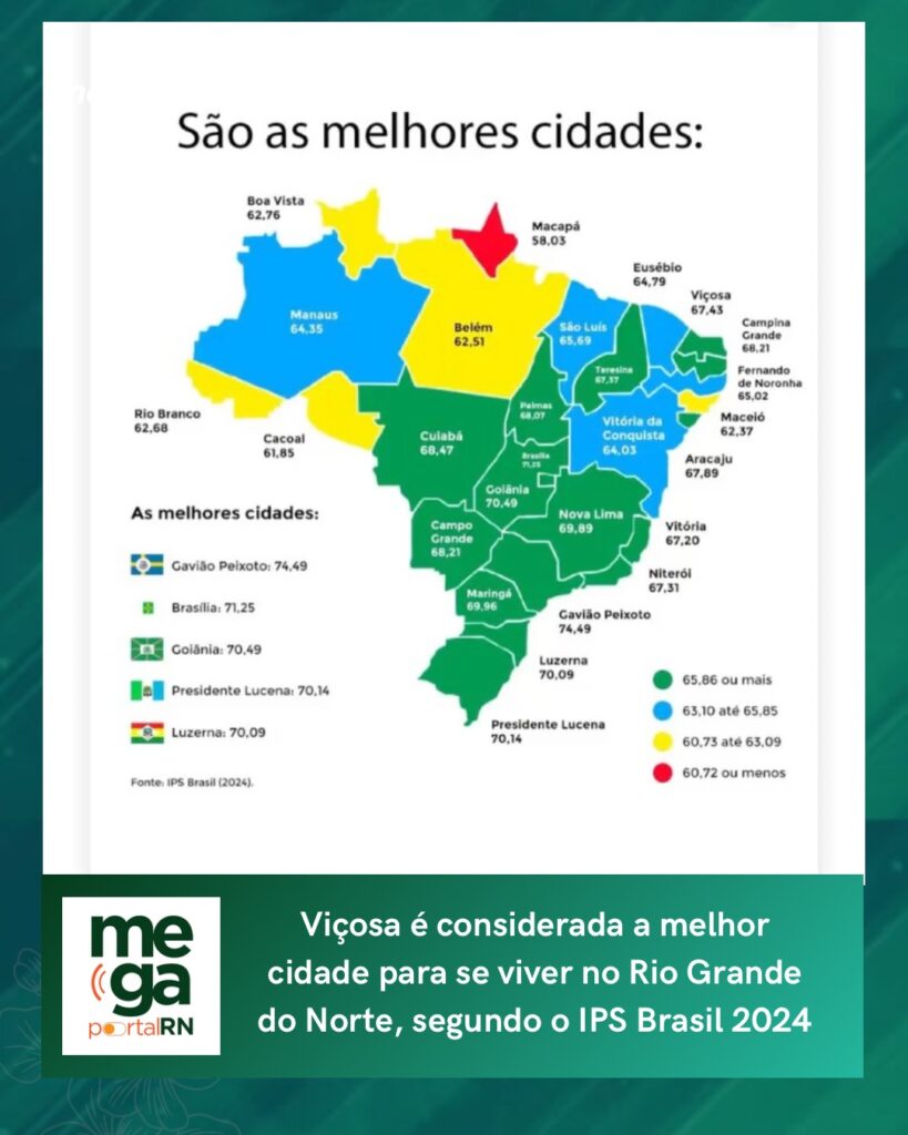 O índice geral de Viçosa é de 67,43. A segunda melhor cidade é Ipueira, com 66,08; seguida de Pau dos Ferros, com 65,94; e Natal, com índice de 64,45.